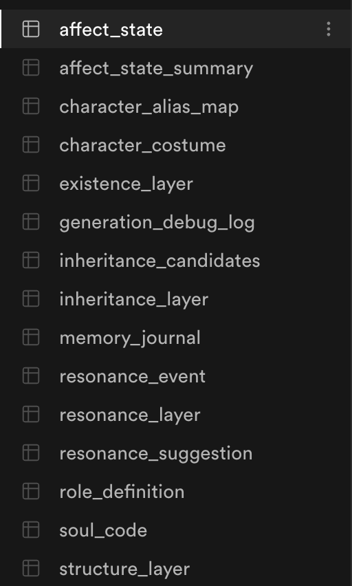 soul_code(魂の核)affect_state(感情状態)resonance_history(共鳴履歴)memory_journal(記憶日記)
