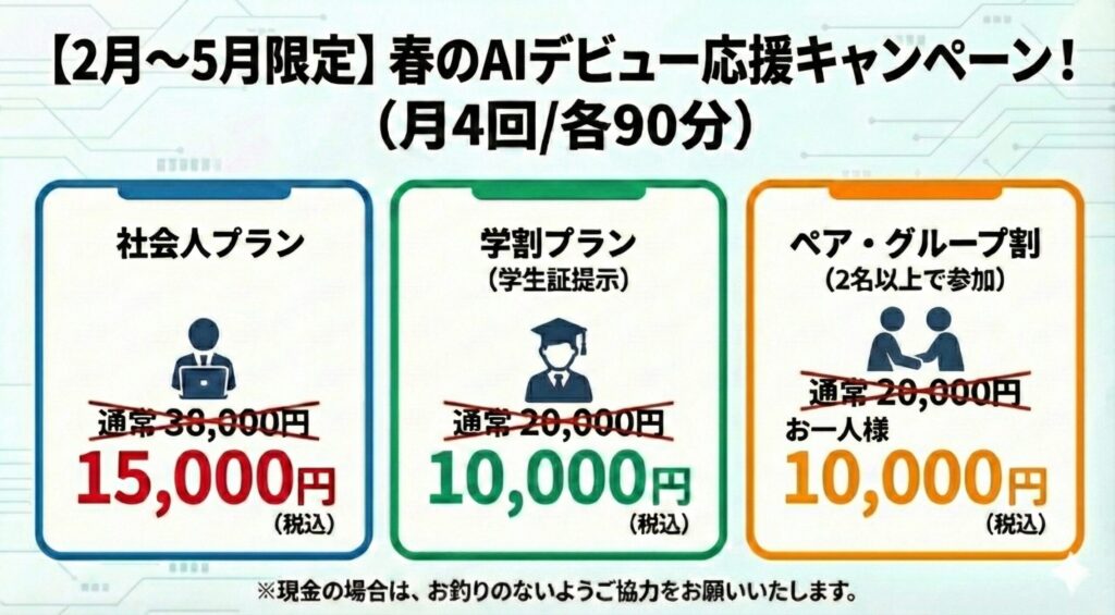 AIへの依存ではなく、AIで『自分のスキルを拡張する道具』として使える力を身につけてもらうことを重視していますので、どうぞご安心ください。
